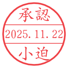 オプションの「電子透かし」をチェックし[生成]すると、見た目には分からないように、UNIXタイムスタンプを識別情報としてPNG形式の日付印に埋め込みます。 日付スタンプメーカーの使い方「部署」「名前」は最大8文字まで入力が可能です。「スタンプの色」を選択し、[生成]ボタン押下で印影画像が更新され、背景を透明に設定したPNG形式とPDF形式の印影画像がリンクからダウンロードできます。 オプションの「電子透かし」は、その性格上日付印ととても相性の良い付加サービスです。 別ページの「タイムスタンプと電子透かし」でも詳しく解説しますが、このオプションを追加することで、日付印が生成された日時に確かにその印が存在していることが証明されます。 ![]() 小迫さんの電子印鑑が作れます。社内でのデータ書類閲覧確認用など、認印的な使い方のできる電子印鑑が作れます。 ![]() 古代文字で落款印が作れます。「落款スタンプメーカー」で作品を引き立たせる落款印が作れます。