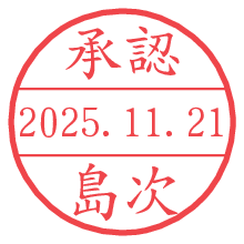 オプションの「電子透かし」をチェックし[生成]すると、見た目には分からないように、UNIXタイムスタンプを識別情報としてPNG形式の日付印に埋め込みます。 日付スタンプメーカーの使い方「部署」「名前」は最大8文字まで入力が可能です。「スタンプの色」を選択し、[生成]ボタン押下で印影画像が更新され、背景を透明に設定したPNG形式とPDF形式の印影画像がリンクからダウンロードできます。 オプションの「電子透かし」は、その性格上日付印ととても相性の良い付加サービスです。 別ページの「タイムスタンプと電子透かし」でも詳しく解説しますが、このオプションを追加することで、日付印が生成された日時に確かにその印が存在していることが証明されます。 ![]() 島次さんの電子印鑑が作れます。社内でのデータ書類閲覧確認用など、認印的な使い方のできる電子印鑑が作れます。 ![]() 古代文字で落款印が作れます。「落款スタンプメーカー」で作品を引き立たせる落款印が作れます。