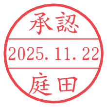 オプションの「電子透かし」をチェックし[生成]すると、見た目には分からないように、UNIXタイムスタンプを識別情報としてPNG形式の日付印に埋め込みます。 日付スタンプメーカーの使い方「部署」「名前」は最大8文字まで入力が可能です。「スタンプの色」を選択し、[生成]ボタン押下で印影画像が更新され、背景を透明に設定したPNG形式とPDF形式の印影画像がリンクからダウンロードできます。 オプションの「電子透かし」は、その性格上日付印ととても相性の良い付加サービスです。 別ページの「タイムスタンプと電子透かし」でも詳しく解説しますが、このオプションを追加することで、日付印が生成された日時に確かにその印が存在していることが証明されます。 ![]() 庭田さんの電子印鑑が作れます。社内でのデータ書類閲覧確認用など、認印的な使い方のできる電子印鑑が作れます。 ![]() 古代文字で落款印が作れます。「落款スタンプメーカー」で作品を引き立たせる落款印が作れます。