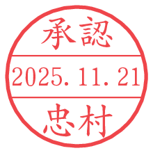 オプションの「電子透かし」をチェックし[生成]すると、見た目には分からないように、UNIXタイムスタンプを識別情報としてPNG形式の日付印に埋め込みます。 日付スタンプメーカーの使い方「部署」「名前」は最大8文字まで入力が可能です。「スタンプの色」を選択し、[生成]ボタン押下で印影画像が更新され、背景を透明に設定したPNG形式とPDF形式の印影画像がリンクからダウンロードできます。 オプションの「電子透かし」は、その性格上日付印ととても相性の良い付加サービスです。 別ページの「タイムスタンプと電子透かし」でも詳しく解説しますが、このオプションを追加することで、日付印が生成された日時に確かにその印が存在していることが証明されます。 ![]() 忠村さんの電子印鑑が作れます。社内でのデータ書類閲覧確認用など、認印的な使い方のできる電子印鑑が作れます。 ![]() 古代文字で落款印が作れます。「落款スタンプメーカー」で作品を引き立たせる落款印が作れます。