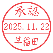 オプションの「電子透かし」をチェックし[生成]すると、見た目には分からないように、UNIXタイムスタンプを識別情報としてPNG形式の日付印に埋め込みます。 日付スタンプメーカーの使い方「部署」「名前」は最大8文字まで入力が可能です。「スタンプの色」を選択し、[生成]ボタン押下で印影画像が更新され、背景を透明に設定したPNG形式とPDF形式の印影画像がリンクからダウンロードできます。 オプションの「電子透かし」は、その性格上日付印ととても相性の良い付加サービスです。 別ページの「タイムスタンプと電子透かし」でも詳しく解説しますが、このオプションを追加することで、日付印が生成された日時に確かにその印が存在していることが証明されます。 ![]() 早稲田さんの電子印鑑が作れます。社内でのデータ書類閲覧確認用など、認印的な使い方のできる電子印鑑が作れます。 ![]() 古代文字で落款印が作れます。「落款スタンプメーカー」で作品を引き立たせる落款印が作れます。