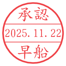 オプションの「電子透かし」をチェックし[生成]すると、見た目には分からないように、UNIXタイムスタンプを識別情報としてPNG形式の日付印に埋め込みます。 日付スタンプメーカーの使い方「部署」「名前」は最大8文字まで入力が可能です。「スタンプの色」を選択し、[生成]ボタン押下で印影画像が更新され、背景を透明に設定したPNG形式とPDF形式の印影画像がリンクからダウンロードできます。 オプションの「電子透かし」は、その性格上日付印ととても相性の良い付加サービスです。 別ページの「タイムスタンプと電子透かし」でも詳しく解説しますが、このオプションを追加することで、日付印が生成された日時に確かにその印が存在していることが証明されます。 ![]() 早船さんの電子印鑑が作れます。社内でのデータ書類閲覧確認用など、認印的な使い方のできる電子印鑑が作れます。 ![]() 古代文字で落款印が作れます。「落款スタンプメーカー」で作品を引き立たせる落款印が作れます。
