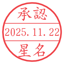 オプションの「電子透かし」をチェックし[生成]すると、見た目には分からないように、UNIXタイムスタンプを識別情報としてPNG形式の日付印に埋め込みます。 日付スタンプメーカーの使い方「部署」「名前」は最大8文字まで入力が可能です。「スタンプの色」を選択し、[生成]ボタン押下で印影画像が更新され、背景を透明に設定したPNG形式とPDF形式の印影画像がリンクからダウンロードできます。 オプションの「電子透かし」は、その性格上日付印ととても相性の良い付加サービスです。 別ページの「タイムスタンプと電子透かし」でも詳しく解説しますが、このオプションを追加することで、日付印が生成された日時に確かにその印が存在していることが証明されます。 ![]() 星名さんの電子印鑑が作れます。社内でのデータ書類閲覧確認用など、認印的な使い方のできる電子印鑑が作れます。 ![]() 古代文字で落款印が作れます。「落款スタンプメーカー」で作品を引き立たせる落款印が作れます。