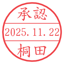 オプションの「電子透かし」をチェックし[生成]すると、見た目には分からないように、UNIXタイムスタンプを識別情報としてPNG形式の日付印に埋め込みます。 日付スタンプメーカーの使い方「部署」「名前」は最大8文字まで入力が可能です。「スタンプの色」を選択し、[生成]ボタン押下で印影画像が更新され、背景を透明に設定したPNG形式とPDF形式の印影画像がリンクからダウンロードできます。 オプションの「電子透かし」は、その性格上日付印ととても相性の良い付加サービスです。 別ページの「タイムスタンプと電子透かし」でも詳しく解説しますが、このオプションを追加することで、日付印が生成された日時に確かにその印が存在していることが証明されます。 ![]() 桐田さんの電子印鑑が作れます。社内でのデータ書類閲覧確認用など、認印的な使い方のできる電子印鑑が作れます。 ![]() 古代文字で落款印が作れます。「落款スタンプメーカー」で作品を引き立たせる落款印が作れます。