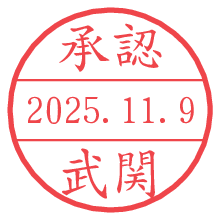 オプションの「電子透かし」をチェックし[生成]すると、見た目には分からないように、UNIXタイムスタンプを識別情報としてPNG形式の日付印に埋め込みます。 日付スタンプメーカーの使い方「部署」「名前」は最大8文字まで入力が可能です。「スタンプの色」を選択し、[生成]ボタン押下で印影画像が更新され、背景を透明に設定したPNG形式とPDF形式の印影画像がリンクからダウンロードできます。 オプションの「電子透かし」は、その性格上日付印ととても相性の良い付加サービスです。 別ページの「タイムスタンプと電子透かし」でも詳しく解説しますが、このオプションを追加することで、日付印が生成された日時に確かにその印が存在していることが証明されます。 ![]() 武関さんの電子印鑑が作れます。社内でのデータ書類閲覧確認用など、認印的な使い方のできる電子印鑑が作れます。 ![]() 古代文字で落款印が作れます。「落款スタンプメーカー」で作品を引き立たせる落款印が作れます。