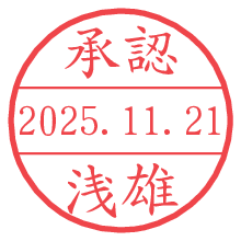 オプションの「電子透かし」をチェックし[生成]すると、見た目には分からないように、UNIXタイムスタンプを識別情報としてPNG形式の日付印に埋め込みます。 日付スタンプメーカーの使い方「部署」「名前」は最大8文字まで入力が可能です。「スタンプの色」を選択し、[生成]ボタン押下で印影画像が更新され、背景を透明に設定したPNG形式とPDF形式の印影画像がリンクからダウンロードできます。 オプションの「電子透かし」は、その性格上日付印ととても相性の良い付加サービスです。 別ページの「タイムスタンプと電子透かし」でも詳しく解説しますが、このオプションを追加することで、日付印が生成された日時に確かにその印が存在していることが証明されます。 ![]() 浅雄さんの電子印鑑が作れます。社内でのデータ書類閲覧確認用など、認印的な使い方のできる電子印鑑が作れます。 ![]() 古代文字で落款印が作れます。「落款スタンプメーカー」で作品を引き立たせる落款印が作れます。