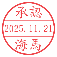 オプションの「電子透かし」をチェックし[生成]すると、見た目には分からないように、UNIXタイムスタンプを識別情報としてPNG形式の日付印に埋め込みます。 日付スタンプメーカーの使い方「部署」「名前」は最大8文字まで入力が可能です。「スタンプの色」を選択し、[生成]ボタン押下で印影画像が更新され、背景を透明に設定したPNG形式とPDF形式の印影画像がリンクからダウンロードできます。 オプションの「電子透かし」は、その性格上日付印ととても相性の良い付加サービスです。 別ページの「タイムスタンプと電子透かし」でも詳しく解説しますが、このオプションを追加することで、日付印が生成された日時に確かにその印が存在していることが証明されます。 ![]() 海馬さんの電子印鑑が作れます。社内でのデータ書類閲覧確認用など、認印的な使い方のできる電子印鑑が作れます。 ![]() 古代文字で落款印が作れます。「落款スタンプメーカー」で作品を引き立たせる落款印が作れます。