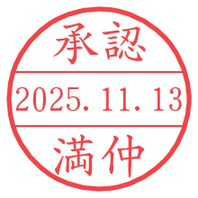 オプションの「電子透かし」をチェックし[生成]すると、見た目には分からないように、UNIXタイムスタンプを識別情報としてPNG形式の日付印に埋め込みます。 日付スタンプメーカーの使い方「部署」「名前」は最大8文字まで入力が可能です。「スタンプの色」を選択し、[生成]ボタン押下で印影画像が更新され、背景を透明に設定したPNG形式とPDF形式の印影画像がリンクからダウンロードできます。 オプションの「電子透かし」は、その性格上日付印ととても相性の良い付加サービスです。 別ページの「タイムスタンプと電子透かし」でも詳しく解説しますが、このオプションを追加することで、日付印が生成された日時に確かにその印が存在していることが証明されます。 ![]() 満仲さんの電子印鑑が作れます。社内でのデータ書類閲覧確認用など、認印的な使い方のできる電子印鑑が作れます。 ![]() 古代文字で落款印が作れます。「落款スタンプメーカー」で作品を引き立たせる落款印が作れます。