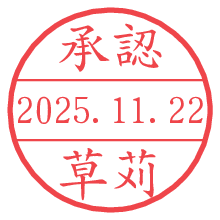 オプションの「電子透かし」をチェックし[生成]すると、見た目には分からないように、UNIXタイムスタンプを識別情報としてPNG形式の日付印に埋め込みます。 日付スタンプメーカーの使い方「部署」「名前」は最大8文字まで入力が可能です。「スタンプの色」を選択し、[生成]ボタン押下で印影画像が更新され、背景を透明に設定したPNG形式とPDF形式の印影画像がリンクからダウンロードできます。 オプションの「電子透かし」は、その性格上日付印ととても相性の良い付加サービスです。 別ページの「タイムスタンプと電子透かし」でも詳しく解説しますが、このオプションを追加することで、日付印が生成された日時に確かにその印が存在していることが証明されます。 ![]() 草苅さんの電子印鑑が作れます。社内でのデータ書類閲覧確認用など、認印的な使い方のできる電子印鑑が作れます。 ![]() 古代文字で落款印が作れます。「落款スタンプメーカー」で作品を引き立たせる落款印が作れます。