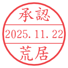 オプションの「電子透かし」をチェックし[生成]すると、見た目には分からないように、UNIXタイムスタンプを識別情報としてPNG形式の日付印に埋め込みます。 日付スタンプメーカーの使い方「部署」「名前」は最大8文字まで入力が可能です。「スタンプの色」を選択し、[生成]ボタン押下で印影画像が更新され、背景を透明に設定したPNG形式とPDF形式の印影画像がリンクからダウンロードできます。 オプションの「電子透かし」は、その性格上日付印ととても相性の良い付加サービスです。 別ページの「タイムスタンプと電子透かし」でも詳しく解説しますが、このオプションを追加することで、日付印が生成された日時に確かにその印が存在していることが証明されます。 ![]() 荒居さんの電子印鑑が作れます。社内でのデータ書類閲覧確認用など、認印的な使い方のできる電子印鑑が作れます。 ![]() 古代文字で落款印が作れます。「落款スタンプメーカー」で作品を引き立たせる落款印が作れます。