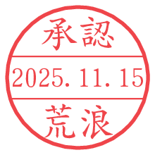 オプションの「電子透かし」をチェックし[生成]すると、見た目には分からないように、UNIXタイムスタンプを識別情報としてPNG形式の日付印に埋め込みます。 日付スタンプメーカーの使い方「部署」「名前」は最大8文字まで入力が可能です。「スタンプの色」を選択し、[生成]ボタン押下で印影画像が更新され、背景を透明に設定したPNG形式とPDF形式の印影画像がリンクからダウンロードできます。 オプションの「電子透かし」は、その性格上日付印ととても相性の良い付加サービスです。 別ページの「タイムスタンプと電子透かし」でも詳しく解説しますが、このオプションを追加することで、日付印が生成された日時に確かにその印が存在していることが証明されます。 ![]() 荒浪さんの電子印鑑が作れます。社内でのデータ書類閲覧確認用など、認印的な使い方のできる電子印鑑が作れます。 ![]() 古代文字で落款印が作れます。「落款スタンプメーカー」で作品を引き立たせる落款印が作れます。