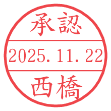 オプションの「電子透かし」をチェックし[生成]すると、見た目には分からないように、UNIXタイムスタンプを識別情報としてPNG形式の日付印に埋め込みます。 日付スタンプメーカーの使い方「部署」「名前」は最大8文字まで入力が可能です。「スタンプの色」を選択し、[生成]ボタン押下で印影画像が更新され、背景を透明に設定したPNG形式とPDF形式の印影画像がリンクからダウンロードできます。 オプションの「電子透かし」は、その性格上日付印ととても相性の良い付加サービスです。 別ページの「タイムスタンプと電子透かし」でも詳しく解説しますが、このオプションを追加することで、日付印が生成された日時に確かにその印が存在していることが証明されます。 ![]() 西橋さんの電子印鑑が作れます。社内でのデータ書類閲覧確認用など、認印的な使い方のできる電子印鑑が作れます。 ![]() 古代文字で落款印が作れます。「落款スタンプメーカー」で作品を引き立たせる落款印が作れます。