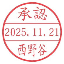 オプションの「電子透かし」をチェックし[生成]すると、見た目には分からないように、UNIXタイムスタンプを識別情報としてPNG形式の日付印に埋め込みます。 日付スタンプメーカーの使い方「部署」「名前」は最大8文字まで入力が可能です。「スタンプの色」を選択し、[生成]ボタン押下で印影画像が更新され、背景を透明に設定したPNG形式とPDF形式の印影画像がリンクからダウンロードできます。 オプションの「電子透かし」は、その性格上日付印ととても相性の良い付加サービスです。 別ページの「タイムスタンプと電子透かし」でも詳しく解説しますが、このオプションを追加することで、日付印が生成された日時に確かにその印が存在していることが証明されます。 ![]() 西野谷さんの電子印鑑が作れます。社内でのデータ書類閲覧確認用など、認印的な使い方のできる電子印鑑が作れます。 ![]() 古代文字で落款印が作れます。「落款スタンプメーカー」で作品を引き立たせる落款印が作れます。