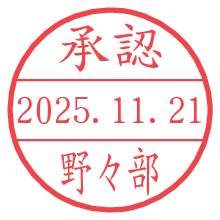 オプションの「電子透かし」をチェックし[生成]すると、見た目には分からないように、UNIXタイムスタンプを識別情報としてPNG形式の日付印に埋め込みます。 日付スタンプメーカーの使い方「部署」「名前」は最大8文字まで入力が可能です。「スタンプの色」を選択し、[生成]ボタン押下で印影画像が更新され、背景を透明に設定したPNG形式とPDF形式の印影画像がリンクからダウンロードできます。 オプションの「電子透かし」は、その性格上日付印ととても相性の良い付加サービスです。 別ページの「タイムスタンプと電子透かし」でも詳しく解説しますが、このオプションを追加することで、日付印が生成された日時に確かにその印が存在していることが証明されます。 ![]() 野々部さんの電子印鑑が作れます。社内でのデータ書類閲覧確認用など、認印的な使い方のできる電子印鑑が作れます。 ![]() 古代文字で落款印が作れます。「落款スタンプメーカー」で作品を引き立たせる落款印が作れます。