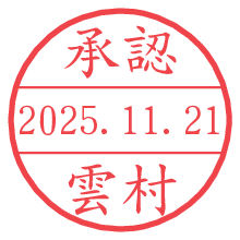 オプションの「電子透かし」をチェックし[生成]すると、見た目には分からないように、UNIXタイムスタンプを識別情報としてPNG形式の日付印に埋め込みます。 日付スタンプメーカーの使い方「部署」「名前」は最大8文字まで入力が可能です。「スタンプの色」を選択し、[生成]ボタン押下で印影画像が更新され、背景を透明に設定したPNG形式とPDF形式の印影画像がリンクからダウンロードできます。 オプションの「電子透かし」は、その性格上日付印ととても相性の良い付加サービスです。 別ページの「タイムスタンプと電子透かし」でも詳しく解説しますが、このオプションを追加することで、日付印が生成された日時に確かにその印が存在していることが証明されます。 ![]() 雲村さんの電子印鑑が作れます。社内でのデータ書類閲覧確認用など、認印的な使い方のできる電子印鑑が作れます。 ![]() 古代文字で落款印が作れます。「落款スタンプメーカー」で作品を引き立たせる落款印が作れます。