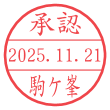 オプションの「電子透かし」をチェックし[生成]すると、見た目には分からないように、UNIXタイムスタンプを識別情報としてPNG形式の日付印に埋め込みます。 日付スタンプメーカーの使い方「部署」「名前」は最大8文字まで入力が可能です。「スタンプの色」を選択し、[生成]ボタン押下で印影画像が更新され、背景を透明に設定したPNG形式とPDF形式の印影画像がリンクからダウンロードできます。 オプションの「電子透かし」は、その性格上日付印ととても相性の良い付加サービスです。 別ページの「タイムスタンプと電子透かし」でも詳しく解説しますが、このオプションを追加することで、日付印が生成された日時に確かにその印が存在していることが証明されます。 ![]() 駒ケ峯さんの電子印鑑が作れます。社内でのデータ書類閲覧確認用など、認印的な使い方のできる電子印鑑が作れます。 ![]() 古代文字で落款印が作れます。「落款スタンプメーカー」で作品を引き立たせる落款印が作れます。