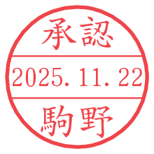 オプションの「電子透かし」をチェックし[生成]すると、見た目には分からないように、UNIXタイムスタンプを識別情報としてPNG形式の日付印に埋め込みます。 日付スタンプメーカーの使い方「部署」「名前」は最大8文字まで入力が可能です。「スタンプの色」を選択し、[生成]ボタン押下で印影画像が更新され、背景を透明に設定したPNG形式とPDF形式の印影画像がリンクからダウンロードできます。 オプションの「電子透かし」は、その性格上日付印ととても相性の良い付加サービスです。 別ページの「タイムスタンプと電子透かし」でも詳しく解説しますが、このオプションを追加することで、日付印が生成された日時に確かにその印が存在していることが証明されます。 ![]() 駒野さんの電子印鑑が作れます。社内でのデータ書類閲覧確認用など、認印的な使い方のできる電子印鑑が作れます。 ![]() 古代文字で落款印が作れます。「落款スタンプメーカー」で作品を引き立たせる落款印が作れます。