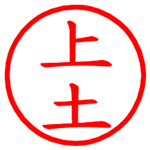 [朱肉の色]を選び、入力窓に“上土”と入力して[生成]ボタンを押すと、印影が更新され、リンクから電子印鑑(デジタル印影)がダウンロードできます。 電子印鑑「上土」の作り方文字表示が変なときや、文字バランスが悪いときは[字形切替]のチェックボックスでON/OFFを切り替え[生成]しなおしてください。 生成される画像は通常の印影「上土.png」と、にじみを表現した少し太めの印影「上土B.png」の背面透過PNG形式2種と、鮮明なPDF形式の印影「上土.pdf」の計3種類です。 朱肉の微妙な色の違いを7色で表現しました。デフォルト(左端)は、JISが定めた朱肉の色のマンセル値(7.5R 5/14)をRGB値(217,66,54)に変換したものになっています。 「電子透かし」にチェックを入れて[生成]ボタンを押すと、タイムスタンプを電子透かしとして埋め込んだセキュアな電子印鑑が作れます。詳細は別ページの「タイムスタンプと電子透かし」でご覧ください。 上土さんの日付印が作れます。「日付スタンプメーカー」は、社内向けの書類に利用されることの多い日付印(データ印)が無料で作れるWebアプリケーションです。中段に日付が入り、上段と下段は、ともに8文字まで文字が入ります。 ![]() 古代文字で落款印が作れます。「落款スタンプメーカー」で作品を引き立たせる落款印が作れます。