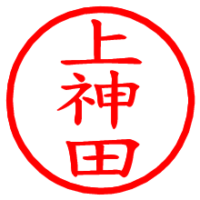 [朱肉の色]を選び、入力窓に“上神田”と入力して[生成]ボタンを押すと、印影が更新され、リンクから電子印鑑(デジタル印影)がダウンロードできます。 電子印鑑「上神田」の作り方文字表示が変なときや、文字バランスが悪いときは[字形切替]のチェックボックスでON/OFFを切り替え[生成]しなおしてください。 生成される画像は通常の印影「上神田.png」と、にじみを表現した少し太めの印影「上神田B.png」の背面透過PNG形式2種と、鮮明なPDF形式の印影「上神田.pdf」の計3種類です。 朱肉の微妙な色の違いを7色で表現しました。デフォルト(左端)は、JISが定めた朱肉の色のマンセル値(7.5R 5/14)をRGB値(217,66,54)に変換したものになっています。 「電子透かし」にチェックを入れて[生成]ボタンを押すと、タイムスタンプを透かしとして埋め込んだセキュアな電子印鑑が作れます。詳細は別ページの「電子透かしとタイムスタンプ」でご覧ください。 上神田さんの日付印が作れます。「日付スタンプメーカー」は、社内向けの書類に利用されることの多い日付印(データ印)が無料で作れるWebアプリケーションです。中段に日付が入り、上段と下段は、ともに8文字まで文字が入ります。 ![]() 古代文字で落款印が作れます。「落款スタンプメーカー」で作品を引き立たせる落款印が作れます。