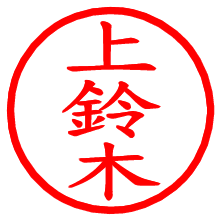 [朱肉の色]を選び、入力窓に“上鈴木”と入力して[生成]ボタンを押すと、印影が更新され、リンクから電子印鑑(デジタル印影)がダウンロードできます。 電子印鑑「上鈴木」の作り方文字表示が変なときや、文字バランスが悪いときは[字形切替]のチェックボックスでON/OFFを切り替え[生成]しなおしてください。 生成される画像は通常の印影「上鈴木.png」と、にじみを表現した少し太めの印影「上鈴木B.png」の背面透過PNG形式2種と、鮮明なPDF形式の印影「上鈴木.pdf」の計3種類です。 朱肉の微妙な色の違いを7色で表現しました。デフォルト(左端)は、JISが定めた朱肉の色のマンセル値(7.5R 5/14)をRGB値(217,66,54)に変換したものになっています。 「電子透かし」にチェックを入れて[生成]ボタンを押すと、タイムスタンプを電子透かしとして埋め込んだセキュアな電子印鑑が作れます。詳細は別ページの「タイムスタンプと電子透かし」でご覧ください。 上鈴木さんの日付印が作れます。「日付スタンプメーカー」は、社内向けの書類に利用されることの多い日付印(データ印)が無料で作れるWebアプリケーションです。中段に日付が入り、上段と下段は、ともに8文字まで文字が入ります。 ![]() 古代文字で落款印が作れます。「落款スタンプメーカー」で作品を引き立たせる落款印が作れます。