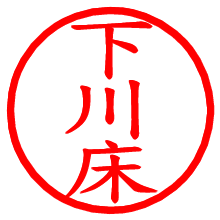 [朱肉の色]を選び、入力窓に“下川床”と入力して[生成]ボタンを押すと、印影が更新され、リンクから電子印鑑(デジタル印影)がダウンロードできます。 電子印鑑「下川床」の作り方文字表示が変なときや、文字バランスが悪いときは[字形切替]のチェックボックスでON/OFFを切り替え[生成]しなおしてください。 生成される画像は通常の印影「下川床.png」と、にじみを表現した少し太めの印影「下川床B.png」の背面透過PNG形式2種と、鮮明なPDF形式の印影「下川床.pdf」の計3種類です。 朱肉の微妙な色の違いを7色で表現しました。デフォルト(左端)は、JISが定めた朱肉の色のマンセル値(7.5R 5/14)をRGB値(217,66,54)に変換したものになっています。 「電子透かし」にチェックを入れて[生成]ボタンを押すと、タイムスタンプを電子透かしとして埋め込んだセキュアな電子印鑑が作れます。詳細は別ページの「タイムスタンプと電子透かし」でご覧ください。 下川床さんの日付印が作れます。「日付スタンプメーカー」は、社内向けの書類に利用されることの多い日付印(データ印)が無料で作れるWebアプリケーションです。中段に日付が入り、上段と下段は、ともに8文字まで文字が入ります。 ![]() 古代文字で落款印が作れます。「落款スタンプメーカー」で作品を引き立たせる落款印が作れます。