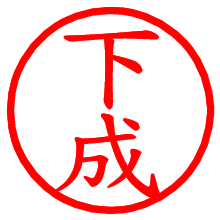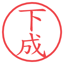 [朱肉の色]を選び、入力窓に“下成”と入力して[生成]ボタンを押すと、印影が更新され、リンクから電子印鑑(デジタル印影)がダウンロードできます。 電子印鑑「下成」の作り方文字表示が変なときや、文字バランスが悪いときは[字形切替]のチェックボックスでON/OFFを切り替え[生成]しなおしてください。 生成される画像は通常の印影「下成.png」と、にじみを表現した少し太めの印影「下成B.png」の背面透過PNG形式2種と、鮮明なPDF形式の印影「下成.pdf」の計3種類です。 朱肉の微妙な色の違いを7色で表現しました。デフォルト(左端)は、JISが定めた朱肉の色のマンセル値(7.5R 5/14)をRGB値(217,66,54)に変換したものになっています。 「電子透かし」にチェックを入れて[生成]ボタンを押すと、タイムスタンプを電子透かしとして埋め込んだセキュアな電子印鑑が作れます。詳細は別ページの「タイムスタンプと電子透かし」でご覧ください。 下成さんの日付印が作れます。「日付スタンプメーカー」は、社内向けの書類に利用されることの多い日付印(データ印)が無料で作れるWebアプリケーションです。中段に日付が入り、上段と下段は、ともに8文字まで文字が入ります。 ![]() 古代文字で落款印が作れます。「落款スタンプメーカー」で作品を引き立たせる落款印が作れます。