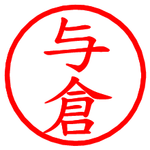 [朱肉の色]を選び、入力窓に“与倉”と入力して[生成]ボタンを押すと、印影が更新され、リンクから電子印鑑(デジタル印影)がダウンロードできます。 電子印鑑「与倉」の作り方文字表示が変なときや、文字バランスが悪いときは[字形切替]のチェックボックスでON/OFFを切り替え[生成]しなおしてください。 生成される画像は通常の印影「与倉.png」と、にじみを表現した少し太めの印影「与倉B.png」の背面透過PNG形式2種と、鮮明なPDF形式の印影「与倉.pdf」の計3種類です。 朱肉の微妙な色の違いを7色で表現しました。デフォルト(左端)は、JISが定めた朱肉の色のマンセル値(7.5R 5/14)をRGB値(217,66,54)に変換したものになっています。 「電子透かし」にチェックを入れて[生成]ボタンを押すと、タイムスタンプを電子透かしとして埋め込んだセキュアな電子印鑑が作れます。詳細は別ページの「タイムスタンプと電子透かし」でご覧ください。 与倉さんの日付印が作れます。「日付スタンプメーカー」は、社内向けの書類に利用されることの多い日付印(データ印)が無料で作れるWebアプリケーションです。中段に日付が入り、上段と下段は、ともに8文字まで文字が入ります。 ![]() 古代文字で落款印が作れます。「落款スタンプメーカー」で作品を引き立たせる落款印が作れます。