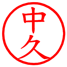 [朱肉の色]を選び、入力窓に“中久”と入力して[生成]ボタンを押すと、印影が更新され、リンクから電子印鑑(デジタル印影)がダウンロードできます。 電子印鑑「中久」の作り方文字表示が変なときや、文字バランスが悪いときは[字形切替]のチェックボックスでON/OFFを切り替え[生成]しなおしてください。 生成される画像は通常の印影「中久.png」と、にじみを表現した少し太めの印影「中久B.png」の背面透過PNG形式2種と、鮮明なPDF形式の印影「中久.pdf」の計3種類です。 朱肉の微妙な色の違いを7色で表現しました。デフォルト(左端)は、JISが定めた朱肉の色のマンセル値(7.5R 5/14)をRGB値(217,66,54)に変換したものになっています。 「電子透かし」にチェックを入れて[生成]ボタンを押すと、タイムスタンプを透かしとして埋め込んだセキュアな電子印鑑が作れます。詳細は別ページの「電子透かしとタイムスタンプ」でご覧ください。 中久さんの日付印が作れます。「日付スタンプメーカー」は、社内向けの書類に利用されることの多い日付印(データ印)が無料で作れるWebアプリケーションです。中段に日付が入り、上段と下段は、ともに8文字まで文字が入ります。 ![]() 古代文字で落款印が作れます。「落款スタンプメーカー」で作品を引き立たせる落款印が作れます。