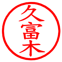 [朱肉の色]を選び、入力窓に“久富木”と入力して[生成]ボタンを押すと、印影が更新され、リンクから電子印鑑(デジタル印影)がダウンロードできます。 電子印鑑「久富木」の作り方文字表示が変なときや、文字バランスが悪いときは[字形切替]のチェックボックスでON/OFFを切り替え[生成]しなおしてください。 生成される画像は通常の印影「久富木.png」と、にじみを表現した少し太めの印影「久富木B.png」の背面透過PNG形式2種と、鮮明なPDF形式の印影「久富木.pdf」の計3種類です。 朱肉の微妙な色の違いを7色で表現しました。デフォルト(左端)は、JISが定めた朱肉の色のマンセル値(7.5R 5/14)をRGB値(217,66,54)に変換したものになっています。 「電子透かし」にチェックを入れて[生成]ボタンを押すと、タイムスタンプを電子透かしとして埋め込んだセキュアな電子印鑑が作れます。詳細は別ページの「タイムスタンプと電子透かし」でご覧ください。 久富木さんの日付印が作れます。「日付スタンプメーカー」は、社内向けの書類に利用されることの多い日付印(データ印)が無料で作れるWebアプリケーションです。中段に日付が入り、上段と下段は、ともに8文字まで文字が入ります。 ![]() 古代文字で落款印が作れます。「落款スタンプメーカー」で作品を引き立たせる落款印が作れます。
