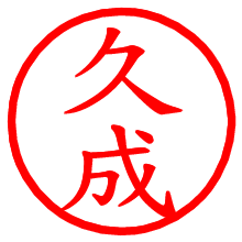 [朱肉の色]を選び、入力窓に“久成”と入力して[生成]ボタンを押すと、印影が更新され、リンクから電子印鑑(デジタル印影)がダウンロードできます。 電子印鑑「久成」の作り方文字表示が変なときや、文字バランスが悪いときは[字形切替]のチェックボックスでON/OFFを切り替え[生成]しなおしてください。 生成される画像は通常の印影「久成.png」と、にじみを表現した少し太めの印影「久成B.png」の背面透過PNG形式2種と、鮮明なPDF形式の印影「久成.pdf」の計3種類です。 朱肉の微妙な色の違いを7色で表現しました。デフォルト(左端)は、JISが定めた朱肉の色のマンセル値(7.5R 5/14)をRGB値(217,66,54)に変換したものになっています。 「電子透かし」にチェックを入れて[生成]ボタンを押すと、タイムスタンプを電子透かしとして埋め込んだセキュアな電子印鑑が作れます。詳細は別ページの「タイムスタンプと電子透かし」でご覧ください。 久成さんの日付印が作れます。「日付スタンプメーカー」は、社内向けの書類に利用されることの多い日付印(データ印)が無料で作れるWebアプリケーションです。中段に日付が入り、上段と下段は、ともに8文字まで文字が入ります。 ![]() 古代文字で落款印が作れます。「落款スタンプメーカー」で作品を引き立たせる落款印が作れます。