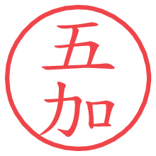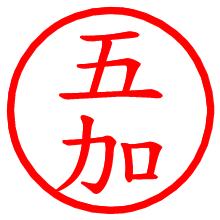 [朱肉の色]を選び、入力窓に“五加”と入力して[生成]ボタンを押すと、印影が更新され、リンクから電子印鑑(デジタル印影)がダウンロードできます。 電子印鑑「五加」の作り方文字表示が変なときや、文字バランスが悪いときは[字形切替]のチェックボックスでON/OFFを切り替え[生成]しなおしてください。 生成される画像は通常の印影「五加.png」と、にじみを表現した少し太めの印影「五加B.png」の背面透過PNG形式2種と、鮮明なPDF形式の印影「五加.pdf」の計3種類です。 朱肉の微妙な色の違いを7色で表現しました。デフォルト(左端)は、JISが定めた朱肉の色のマンセル値(7.5R 5/14)をRGB値(217,66,54)に変換したものになっています。 「電子透かし」にチェックを入れて[生成]ボタンを押すと、タイムスタンプを電子透かしとして埋め込んだセキュアな電子印鑑が作れます。詳細は別ページの「タイムスタンプと電子透かし」でご覧ください。 五加さんの日付印が作れます。「日付スタンプメーカー」は、社内向けの書類に利用されることの多い日付印(データ印)が無料で作れるWebアプリケーションです。中段に日付が入り、上段と下段は、ともに8文字まで文字が入ります。 ![]() 古代文字で落款印が作れます。「落款スタンプメーカー」で作品を引き立たせる落款印が作れます。