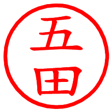 [朱肉の色]を選び、入力窓に“五田”と入力して[生成]ボタンを押すと、印影が更新され、リンクから電子印鑑(デジタル印影)がダウンロードできます。 電子印鑑「五田」の作り方文字表示が変なときや、文字バランスが悪いときは[字形切替]のチェックボックスでON/OFFを切り替え[生成]しなおしてください。 生成される画像は通常の印影「五田.png」と、にじみを表現した少し太めの印影「五田B.png」の背面透過PNG形式2種と、鮮明なPDF形式の印影「五田.pdf」の計3種類です。 朱肉の微妙な色の違いを7色で表現しました。デフォルト(左端)は、JISが定めた朱肉の色のマンセル値(7.5R 5/14)をRGB値(217,66,54)に変換したものになっています。 「電子透かし」にチェックを入れて[生成]ボタンを押すと、タイムスタンプを透かしとして埋め込んだセキュアな電子印鑑が作れます。詳細は別ページの「電子透かしとタイムスタンプ」でご覧ください。 五田さんの日付印が作れます。「日付スタンプメーカー」は、社内向けの書類に利用されることの多い日付印(データ印)が無料で作れるWebアプリケーションです。中段に日付が入り、上段と下段は、ともに8文字まで文字が入ります。 ![]() 古代文字で落款印が作れます。「落款スタンプメーカー」で作品を引き立たせる落款印が作れます。