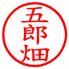 [朱肉の色]を選び、入力窓に“五郎畑”と入力して[生成]ボタンを押すと、印影が更新され、リンクから電子印鑑(デジタル印影)がダウンロードできます。 電子印鑑「五郎畑」の作り方文字表示が変なときや、文字バランスが悪いときは[字形切替]のチェックボックスでON/OFFを切り替え[生成]しなおしてください。 生成される画像は通常の印影「五郎畑.png」と、にじみを表現した少し太めの印影「五郎畑B.png」の背面透過PNG形式2種と、鮮明なPDF形式の印影「五郎畑.pdf」の計3種類です。 朱肉の微妙な色の違いを7色で表現しました。デフォルト(左端)は、JISが定めた朱肉の色のマンセル値(7.5R 5/14)をRGB値(217,66,54)に変換したものになっています。 「電子透かし」にチェックを入れて[生成]ボタンを押すと、タイムスタンプを電子透かしとして埋め込んだセキュアな電子印鑑が作れます。詳細は別ページの「タイムスタンプと電子透かし」でご覧ください。 五郎畑さんの日付印が作れます。「日付スタンプメーカー」は、社内向けの書類に利用されることの多い日付印(データ印)が無料で作れるWebアプリケーションです。中段に日付が入り、上段と下段は、ともに8文字まで文字が入ります。 ![]() 古代文字で落款印が作れます。「落款スタンプメーカー」で作品を引き立たせる落款印が作れます。