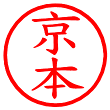 [朱肉の色]を選び、入力窓に“京本”と入力して[生成]ボタンを押すと、印影が更新され、リンクから電子印鑑(デジタル印影)がダウンロードできます。 電子印鑑「京本」の作り方文字表示が変なときや、文字バランスが悪いときは[字形切替]のチェックボックスでON/OFFを切り替え[生成]しなおしてください。 生成される画像は通常の印影「京本.png」と、にじみを表現した少し太めの印影「京本B.png」の背面透過PNG形式2種と、鮮明なPDF形式の印影「京本.pdf」の計3種類です。 朱肉の微妙な色の違いを7色で表現しました。デフォルト(左端)は、JISが定めた朱肉の色のマンセル値(7.5R 5/14)をRGB値(217,66,54)に変換したものになっています。 「電子透かし」にチェックを入れて[生成]ボタンを押すと、タイムスタンプを電子透かしとして埋め込んだセキュアな電子印鑑が作れます。詳細は別ページの「タイムスタンプと電子透かし」でご覧ください。 京本さんの日付印が作れます。「日付スタンプメーカー」は、社内向けの書類に利用されることの多い日付印(データ印)が無料で作れるWebアプリケーションです。中段に日付が入り、上段と下段は、ともに8文字まで文字が入ります。 ![]() 古代文字で落款印が作れます。「落款スタンプメーカー」で作品を引き立たせる落款印が作れます。