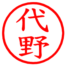 [朱肉の色]を選び、入力窓に“代野”と入力して[生成]ボタンを押すと、印影が更新され、リンクから電子印鑑(デジタル印影)がダウンロードできます。 電子印鑑「代野」の作り方文字表示が変なときや、文字バランスが悪いときは[字形切替]のチェックボックスでON/OFFを切り替え[生成]しなおしてください。 生成される画像は通常の印影「代野.png」と、にじみを表現した少し太めの印影「代野B.png」の背面透過PNG形式2種と、鮮明なPDF形式の印影「代野.pdf」の計3種類です。 朱肉の微妙な色の違いを7色で表現しました。デフォルト(左端)は、JISが定めた朱肉の色のマンセル値(7.5R 5/14)をRGB値(217,66,54)に変換したものになっています。 「電子透かし」にチェックを入れて[生成]ボタンを押すと、タイムスタンプを電子透かしとして埋め込んだセキュアな電子印鑑が作れます。詳細は別ページの「タイムスタンプと電子透かし」でご覧ください。 代野さんの日付印が作れます。「日付スタンプメーカー」は、社内向けの書類に利用されることの多い日付印(データ印)が無料で作れるWebアプリケーションです。中段に日付が入り、上段と下段は、ともに8文字まで文字が入ります。 ![]() 古代文字で落款印が作れます。「落款スタンプメーカー」で作品を引き立たせる落款印が作れます。