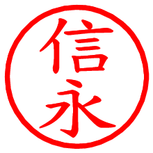 [朱肉の色]を選び、入力窓に“信永”と入力して[生成]ボタンを押すと、印影が更新され、リンクから電子印鑑(デジタル印影)がダウンロードできます。 電子印鑑「信永」の作り方文字表示が変なときや、文字バランスが悪いときは[字形切替]のチェックボックスでON/OFFを切り替え[生成]しなおしてください。 生成される画像は通常の印影「信永.png」と、にじみを表現した少し太めの印影「信永B.png」の背面透過PNG形式2種と、鮮明なPDF形式の印影「信永.pdf」の計3種類です。 朱肉の微妙な色の違いを7色で表現しました。デフォルト(左端)は、JISが定めた朱肉の色のマンセル値(7.5R 5/14)をRGB値(217,66,54)に変換したものになっています。 「電子透かし」にチェックを入れて[生成]ボタンを押すと、タイムスタンプを電子透かしとして埋め込んだセキュアな電子印鑑が作れます。詳細は別ページの「タイムスタンプと電子透かし」でご覧ください。 信永さんの日付印が作れます。「日付スタンプメーカー」は、社内向けの書類に利用されることの多い日付印(データ印)が無料で作れるWebアプリケーションです。中段に日付が入り、上段と下段は、ともに8文字まで文字が入ります。 ![]() 古代文字で落款印が作れます。「落款スタンプメーカー」で作品を引き立たせる落款印が作れます。