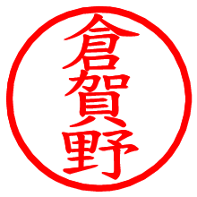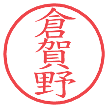 [朱肉の色]を選び、入力窓に“倉賀野”と入力して[生成]ボタンを押すと、印影が更新され、リンクから電子印鑑(デジタル印影)がダウンロードできます。 電子印鑑「倉賀野」の作り方文字表示が変なときや、文字バランスが悪いときは[字形切替]のチェックボックスでON/OFFを切り替え[生成]しなおしてください。 生成される画像は通常の印影「倉賀野.png」と、にじみを表現した少し太めの印影「倉賀野B.png」の背面透過PNG形式2種と、鮮明なPDF形式の印影「倉賀野.pdf」の計3種類です。 朱肉の微妙な色の違いを7色で表現しました。デフォルト(左端)は、JISが定めた朱肉の色のマンセル値(7.5R 5/14)をRGB値(217,66,54)に変換したものになっています。 「電子透かし」にチェックを入れて[生成]ボタンを押すと、タイムスタンプを透かしとして埋め込んだセキュアな電子印鑑が作れます。詳細は別ページの「電子透かしとタイムスタンプ」でご覧ください。  倉賀野さんの日付印が作れます。「日付スタンプメーカー」は、社内向けの書類に利用されることの多い日付印(データ印)が無料で作れるWebアプリケーションです。中段に日付が入り、上段と下段は、ともに8文字まで文字が入ります。 ![]()  古代文字で落款印が作れます。「落款スタンプメーカー」で作品を引き立たせる落款印が作れます。