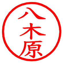 [朱肉の色]を選び、入力窓に“八木原”と入力して[生成]ボタンを押すと、印影が更新され、リンクから電子印鑑(デジタル印影)がダウンロードできます。 電子印鑑「八木原」の作り方文字表示が変なときや、文字バランスが悪いときは[字形切替]のチェックボックスでON/OFFを切り替え[生成]しなおしてください。 生成される画像は通常の印影「八木原.png」と、にじみを表現した少し太めの印影「八木原B.png」の背面透過PNG形式2種と、鮮明なPDF形式の印影「八木原.pdf」の計3種類です。 朱肉の微妙な色の違いを7色で表現しました。デフォルト(左端)は、JISが定めた朱肉の色のマンセル値(7.5R 5/14)をRGB値(217,66,54)に変換したものになっています。 「電子透かし」にチェックを入れて[生成]ボタンを押すと、タイムスタンプを電子透かしとして埋め込んだセキュアな電子印鑑が作れます。詳細は別ページの「タイムスタンプと電子透かし」でご覧ください。 八木原さんの日付印が作れます。「日付スタンプメーカー」は、社内向けの書類に利用されることの多い日付印(データ印)が無料で作れるWebアプリケーションです。中段に日付が入り、上段と下段は、ともに8文字まで文字が入ります。 ![]() 古代文字で落款印が作れます。「落款スタンプメーカー」で作品を引き立たせる落款印が作れます。