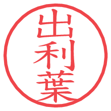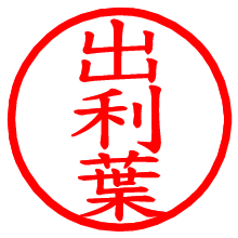 [朱肉の色]を選び、入力窓に“出利葉”と入力して[生成]ボタンを押すと、印影が更新され、リンクから電子印鑑(デジタル印影)がダウンロードできます。 電子印鑑「出利葉」の作り方文字表示が変なときや、文字バランスが悪いときは[字形切替]のチェックボックスでON/OFFを切り替え[生成]しなおしてください。 生成される画像は通常の印影「出利葉.png」と、にじみを表現した少し太めの印影「出利葉B.png」の背面透過PNG形式2種と、鮮明なPDF形式の印影「出利葉.pdf」の計3種類です。 朱肉の微妙な色の違いを7色で表現しました。デフォルト(左端)は、JISが定めた朱肉の色のマンセル値(7.5R 5/14)をRGB値(217,66,54)に変換したものになっています。 「電子透かし」にチェックを入れて[生成]ボタンを押すと、タイムスタンプを電子透かしとして埋め込んだセキュアな電子印鑑が作れます。詳細は別ページの「タイムスタンプと電子透かし」でご覧ください。 出利葉さんの日付印が作れます。「日付スタンプメーカー」は、社内向けの書類に利用されることの多い日付印(データ印)が無料で作れるWebアプリケーションです。中段に日付が入り、上段と下段は、ともに8文字まで文字が入ります。 ![]() 古代文字で落款印が作れます。「落款スタンプメーカー」で作品を引き立たせる落款印が作れます。
