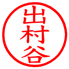 [朱肉の色]を選び、入力窓に“出村谷”と入力して[生成]ボタンを押すと、印影が更新され、リンクから電子印鑑(デジタル印影)がダウンロードできます。 電子印鑑「出村谷」の作り方文字表示が変なときや、文字バランスが悪いときは[字形切替]のチェックボックスでON/OFFを切り替え[生成]しなおしてください。 生成される画像は通常の印影「出村谷.png」と、にじみを表現した少し太めの印影「出村谷B.png」の背面透過PNG形式2種と、鮮明なPDF形式の印影「出村谷.pdf」の計3種類です。 朱肉の微妙な色の違いを7色で表現しました。デフォルト(左端)は、JISが定めた朱肉の色のマンセル値(7.5R 5/14)をRGB値(217,66,54)に変換したものになっています。 「電子透かし」にチェックを入れて[生成]ボタンを押すと、タイムスタンプを電子透かしとして埋め込んだセキュアな電子印鑑が作れます。詳細は別ページの「タイムスタンプと電子透かし」でご覧ください。 出村谷さんの日付印が作れます。「日付スタンプメーカー」は、社内向けの書類に利用されることの多い日付印(データ印)が無料で作れるWebアプリケーションです。中段に日付が入り、上段と下段は、ともに8文字まで文字が入ります。 ![]() 古代文字で落款印が作れます。「落款スタンプメーカー」で作品を引き立たせる落款印が作れます。