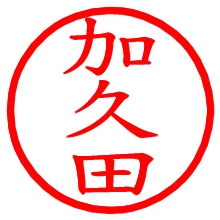 [朱肉の色]を選び、入力窓に“加久田”と入力して[生成]ボタンを押すと、印影が更新され、リンクから電子印鑑(デジタル印影)がダウンロードできます。 電子印鑑「加久田」の作り方文字表示が変なときや、文字バランスが悪いときは[字形切替]のチェックボックスでON/OFFを切り替え[生成]しなおしてください。 生成される画像は通常の印影「加久田.png」と、にじみを表現した少し太めの印影「加久田B.png」の背面透過PNG形式2種と、鮮明なPDF形式の印影「加久田.pdf」の計3種類です。 朱肉の微妙な色の違いを7色で表現しました。デフォルト(左端)は、JISが定めた朱肉の色のマンセル値(7.5R 5/14)をRGB値(217,66,54)に変換したものになっています。 「電子透かし」にチェックを入れて[生成]ボタンを押すと、タイムスタンプを電子透かしとして埋め込んだセキュアな電子印鑑が作れます。詳細は別ページの「タイムスタンプと電子透かし」でご覧ください。 加久田さんの日付印が作れます。「日付スタンプメーカー」は、社内向けの書類に利用されることの多い日付印(データ印)が無料で作れるWebアプリケーションです。中段に日付が入り、上段と下段は、ともに8文字まで文字が入ります。 ![]() 古代文字で落款印が作れます。「落款スタンプメーカー」で作品を引き立たせる落款印が作れます。