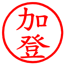 [朱肉の色]を選び、入力窓に“加登”と入力して[生成]ボタンを押すと、印影が更新され、リンクから電子印鑑(デジタル印影)がダウンロードできます。 電子印鑑「加登」の作り方文字表示が変なときや、文字バランスが悪いときは[字形切替]のチェックボックスでON/OFFを切り替え[生成]しなおしてください。 生成される画像は通常の印影「加登.png」と、にじみを表現した少し太めの印影「加登B.png」の背面透過PNG形式2種と、鮮明なPDF形式の印影「加登.pdf」の計3種類です。 朱肉の微妙な色の違いを7色で表現しました。デフォルト(左端)は、JISが定めた朱肉の色のマンセル値(7.5R 5/14)をRGB値(217,66,54)に変換したものになっています。 「電子透かし」にチェックを入れて[生成]ボタンを押すと、タイムスタンプを電子透かしとして埋め込んだセキュアな電子印鑑が作れます。詳細は別ページの「タイムスタンプと電子透かし」でご覧ください。 加登さんの日付印が作れます。「日付スタンプメーカー」は、社内向けの書類に利用されることの多い日付印(データ印)が無料で作れるWebアプリケーションです。中段に日付が入り、上段と下段は、ともに8文字まで文字が入ります。 ![]() 古代文字で落款印が作れます。「落款スタンプメーカー」で作品を引き立たせる落款印が作れます。