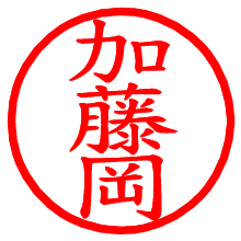 [朱肉の色]を選び、入力窓に“加藤岡”と入力して[生成]ボタンを押すと、印影が更新され、リンクから電子印鑑(デジタル印影)がダウンロードできます。 電子印鑑「加藤岡」の作り方文字表示が変なときや、文字バランスが悪いときは[字形切替]のチェックボックスでON/OFFを切り替え[生成]しなおしてください。 生成される画像は通常の印影「加藤岡.png」と、にじみを表現した少し太めの印影「加藤岡B.png」の背面透過PNG形式2種と、鮮明なPDF形式の印影「加藤岡.pdf」の計3種類です。 朱肉の微妙な色の違いを7色で表現しました。デフォルト(左端)は、JISが定めた朱肉の色のマンセル値(7.5R 5/14)をRGB値(217,66,54)に変換したものになっています。 「電子透かし」にチェックを入れて[生成]ボタンを押すと、タイムスタンプを電子透かしとして埋め込んだセキュアな電子印鑑が作れます。詳細は別ページの「タイムスタンプと電子透かし」でご覧ください。 加藤岡さんの日付印が作れます。「日付スタンプメーカー」は、社内向けの書類に利用されることの多い日付印(データ印)が無料で作れるWebアプリケーションです。中段に日付が入り、上段と下段は、ともに8文字まで文字が入ります。 ![]() 古代文字で落款印が作れます。「落款スタンプメーカー」で作品を引き立たせる落款印が作れます。