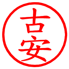 [朱肉の色]を選び、入力窓に“古安”と入力して[生成]ボタンを押すと、印影が更新され、リンクから電子印鑑(デジタル印影)がダウンロードできます。 電子印鑑「古安」の作り方文字表示が変なときや、文字バランスが悪いときは[字形切替]のチェックボックスでON/OFFを切り替え[生成]しなおしてください。 生成される画像は通常の印影「古安.png」と、にじみを表現した少し太めの印影「古安B.png」の背面透過PNG形式2種と、鮮明なPDF形式の印影「古安.pdf」の計3種類です。 朱肉の微妙な色の違いを7色で表現しました。デフォルト(左端)は、JISが定めた朱肉の色のマンセル値(7.5R 5/14)をRGB値(217,66,54)に変換したものになっています。 「電子透かし」にチェックを入れて[生成]ボタンを押すと、タイムスタンプを電子透かしとして埋め込んだセキュアな電子印鑑が作れます。詳細は別ページの「タイムスタンプと電子透かし」でご覧ください。 古安さんの日付印が作れます。「日付スタンプメーカー」は、社内向けの書類に利用されることの多い日付印(データ印)が無料で作れるWebアプリケーションです。中段に日付が入り、上段と下段は、ともに8文字まで文字が入ります。 ![]() 古代文字で落款印が作れます。「落款スタンプメーカー」で作品を引き立たせる落款印が作れます。