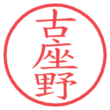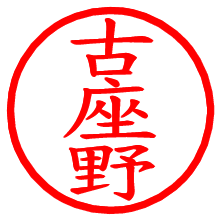[朱肉の色]を選び、入力窓に“古座野”と入力して[生成]ボタンを押すと、印影が更新され、リンクから電子印鑑(デジタル印影)がダウンロードできます。 電子印鑑「古座野」の作り方文字表示が変なときや、文字バランスが悪いときは[字形切替]のチェックボックスでON/OFFを切り替え[生成]しなおしてください。 生成される画像は通常の印影「古座野.png」と、にじみを表現した少し太めの印影「古座野B.png」の背面透過PNG形式2種と、鮮明なPDF形式の印影「古座野.pdf」の計3種類です。 朱肉の微妙な色の違いを7色で表現しました。デフォルト(左端)は、JISが定めた朱肉の色のマンセル値(7.5R 5/14)をRGB値(217,66,54)に変換したものになっています。 「電子透かし」にチェックを入れて[生成]ボタンを押すと、タイムスタンプを電子透かしとして埋め込んだセキュアな電子印鑑が作れます。詳細は別ページの「タイムスタンプと電子透かし」でご覧ください。 古座野さんの日付印が作れます。「日付スタンプメーカー」は、社内向けの書類に利用されることの多い日付印(データ印)が無料で作れるWebアプリケーションです。中段に日付が入り、上段と下段は、ともに8文字まで文字が入ります。 ![]() 古代文字で落款印が作れます。「落款スタンプメーカー」で作品を引き立たせる落款印が作れます。
