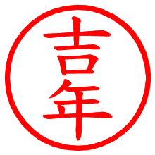 [朱肉の色]を選び、入力窓に“吉年”と入力して[生成]ボタンを押すと、印影が更新され、リンクから電子印鑑(デジタル印影)がダウンロードできます。 電子印鑑「吉年」の作り方文字表示が変なときや、文字バランスが悪いときは[字形切替]のチェックボックスでON/OFFを切り替え[生成]しなおしてください。 生成される画像は通常の印影「吉年.png」と、にじみを表現した少し太めの印影「吉年B.png」の背面透過PNG形式2種と、鮮明なPDF形式の印影「吉年.pdf」の計3種類です。 朱肉の微妙な色の違いを7色で表現しました。デフォルト(左端)は、JISが定めた朱肉の色のマンセル値(7.5R 5/14)をRGB値(217,66,54)に変換したものになっています。 「電子透かし」にチェックを入れて[生成]ボタンを押すと、タイムスタンプを電子透かしとして埋め込んだセキュアな電子印鑑が作れます。詳細は別ページの「タイムスタンプと電子透かし」でご覧ください。 吉年さんの日付印が作れます。「日付スタンプメーカー」は、社内向けの書類に利用されることの多い日付印(データ印)が無料で作れるWebアプリケーションです。中段に日付が入り、上段と下段は、ともに8文字まで文字が入ります。 ![]() 古代文字で落款印が作れます。「落款スタンプメーカー」で作品を引き立たせる落款印が作れます。