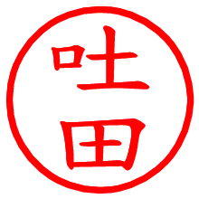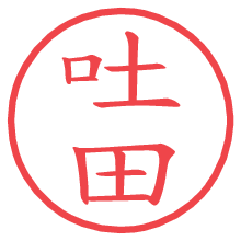 [朱肉の色]を選び、入力窓に“吐田”と入力して[生成]ボタンを押すと、印影が更新され、リンクから電子印鑑(デジタル印影)がダウンロードできます。 電子印鑑「吐田」の作り方文字表示が変なときや、文字バランスが悪いときは[字形切替]のチェックボックスでON/OFFを切り替え[生成]しなおしてください。 生成される画像は通常の印影「吐田.png」と、にじみを表現した少し太めの印影「吐田B.png」の背面透過PNG形式2種と、鮮明なPDF形式の印影「吐田.pdf」の計3種類です。 朱肉の微妙な色の違いを7色で表現しました。デフォルト(左端)は、JISが定めた朱肉の色のマンセル値(7.5R 5/14)をRGB値(217,66,54)に変換したものになっています。 「電子透かし」にチェックを入れて[生成]ボタンを押すと、タイムスタンプを透かしとして埋め込んだセキュアな電子印鑑が作れます。詳細は別ページの「電子透かしとタイムスタンプ」でご覧ください。  吐田さんの日付印が作れます。「日付スタンプメーカー」は、社内向けの書類に利用されることの多い日付印(データ印)が無料で作れるWebアプリケーションです。中段に日付が入り、上段と下段は、ともに8文字まで文字が入ります。 ![]()  古代文字で落款印が作れます。「落款スタンプメーカー」で作品を引き立たせる落款印が作れます。