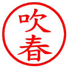 [朱肉の色]を選び、入力窓に“吹春”と入力して[生成]ボタンを押すと、印影が更新され、リンクから電子印鑑(デジタル印影)がダウンロードできます。 電子印鑑「吹春」の作り方文字表示が変なときや、文字バランスが悪いときは[字形切替]のチェックボックスでON/OFFを切り替え[生成]しなおしてください。 生成される画像は通常の印影「吹春.png」と、にじみを表現した少し太めの印影「吹春B.png」の背面透過PNG形式2種と、鮮明なPDF形式の印影「吹春.pdf」の計3種類です。 朱肉の微妙な色の違いを7色で表現しました。デフォルト(左端)は、JISが定めた朱肉の色のマンセル値(7.5R 5/14)をRGB値(217,66,54)に変換したものになっています。 「電子透かし」にチェックを入れて[生成]ボタンを押すと、タイムスタンプを電子透かしとして埋め込んだセキュアな電子印鑑が作れます。詳細は別ページの「タイムスタンプと電子透かし」でご覧ください。 吹春さんの日付印が作れます。「日付スタンプメーカー」は、社内向けの書類に利用されることの多い日付印(データ印)が無料で作れるWebアプリケーションです。中段に日付が入り、上段と下段は、ともに8文字まで文字が入ります。 ![]() 古代文字で落款印が作れます。「落款スタンプメーカー」で作品を引き立たせる落款印が作れます。
