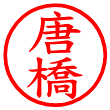 [朱肉の色]を選び、入力窓に“唐橋”と入力して[生成]ボタンを押すと、印影が更新され、リンクから電子印鑑(デジタル印影)がダウンロードできます。 電子印鑑「唐橋」の作り方文字表示が変なときや、文字バランスが悪いときは[字形切替]のチェックボックスでON/OFFを切り替え[生成]しなおしてください。 生成される画像は通常の印影「唐橋.png」と、にじみを表現した少し太めの印影「唐橋B.png」の背面透過PNG形式2種と、鮮明なPDF形式の印影「唐橋.pdf」の計3種類です。 朱肉の微妙な色の違いを7色で表現しました。デフォルト(左端)は、JISが定めた朱肉の色のマンセル値(7.5R 5/14)をRGB値(217,66,54)に変換したものになっています。 「電子透かし」にチェックを入れて[生成]ボタンを押すと、タイムスタンプを電子透かしとして埋め込んだセキュアな電子印鑑が作れます。詳細は別ページの「タイムスタンプと電子透かし」でご覧ください。 唐橋さんの日付印が作れます。「日付スタンプメーカー」は、社内向けの書類に利用されることの多い日付印(データ印)が無料で作れるWebアプリケーションです。中段に日付が入り、上段と下段は、ともに8文字まで文字が入ります。 ![]() 古代文字で落款印が作れます。「落款スタンプメーカー」で作品を引き立たせる落款印が作れます。