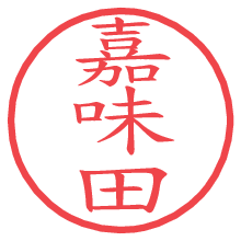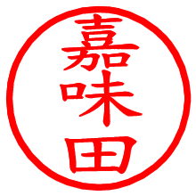 [朱肉の色]を選び、入力窓に“嘉味田”と入力して[生成]ボタンを押すと、印影が更新され、リンクから電子印鑑(デジタル印影)がダウンロードできます。 電子印鑑「嘉味田」の作り方文字表示が変なときや、文字バランスが悪いときは[字形切替]のチェックボックスでON/OFFを切り替え[生成]しなおしてください。 生成される画像は通常の印影「嘉味田.png」と、にじみを表現した少し太めの印影「嘉味田B.png」の背面透過PNG形式2種と、鮮明なPDF形式の印影「嘉味田.pdf」の計3種類です。 朱肉の微妙な色の違いを7色で表現しました。デフォルト(左端)は、JISが定めた朱肉の色のマンセル値(7.5R 5/14)をRGB値(217,66,54)に変換したものになっています。 「電子透かし」にチェックを入れて[生成]ボタンを押すと、タイムスタンプを電子透かしとして埋め込んだセキュアな電子印鑑が作れます。詳細は別ページの「タイムスタンプと電子透かし」でご覧ください。 嘉味田さんの日付印が作れます。「日付スタンプメーカー」は、社内向けの書類に利用されることの多い日付印(データ印)が無料で作れるWebアプリケーションです。中段に日付が入り、上段と下段は、ともに8文字まで文字が入ります。 ![]() 古代文字で落款印が作れます。「落款スタンプメーカー」で作品を引き立たせる落款印が作れます。